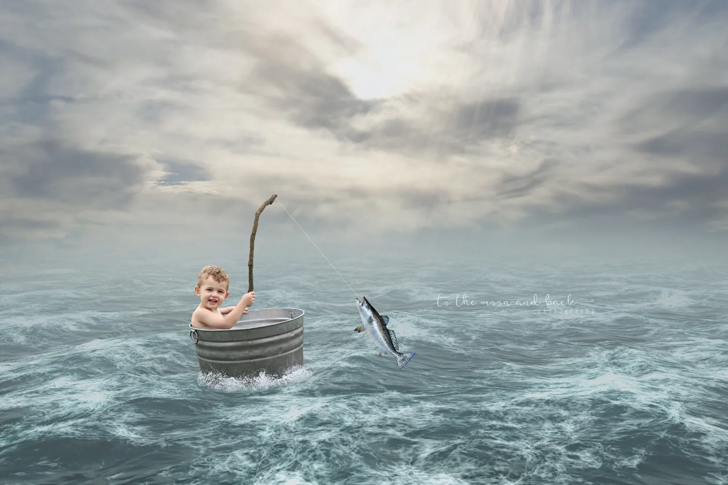 Photoshop Photo Manipulation Composite Magic Creation Milestone Child Photography Custom birthday boy ocean sunlight sunbeam sky fish fishing floating boat
